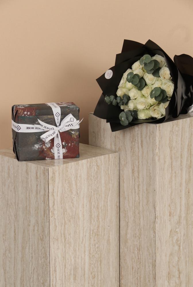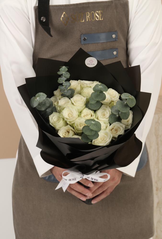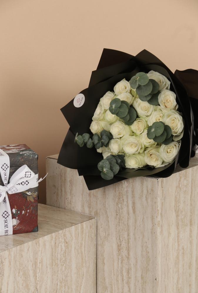 - باقة ورد ابيض يضفي لمسة ساحرة، مما يعزز جمال الزهور والهدايا.