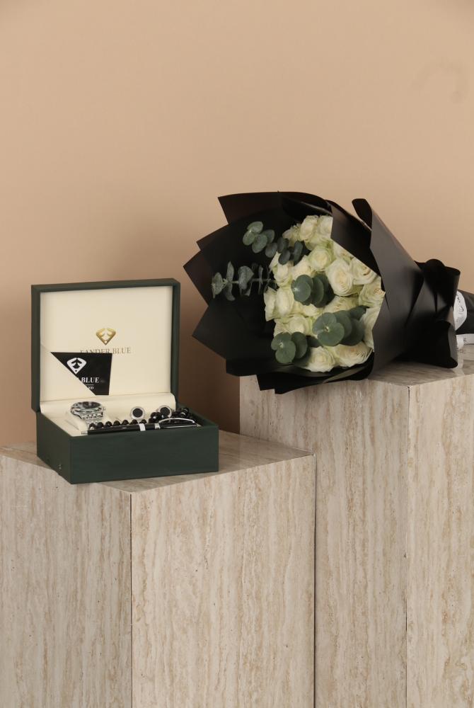 هذا المنتج يجمع بين الأناقة والفخامة، حيث يدمج بين العناصر الطبيعية والجمال الراقي في هدية متكاملة.تفاصيل المنتج:- باقة ورد ابيض يضفي لمسة ساحرة، مما ...
