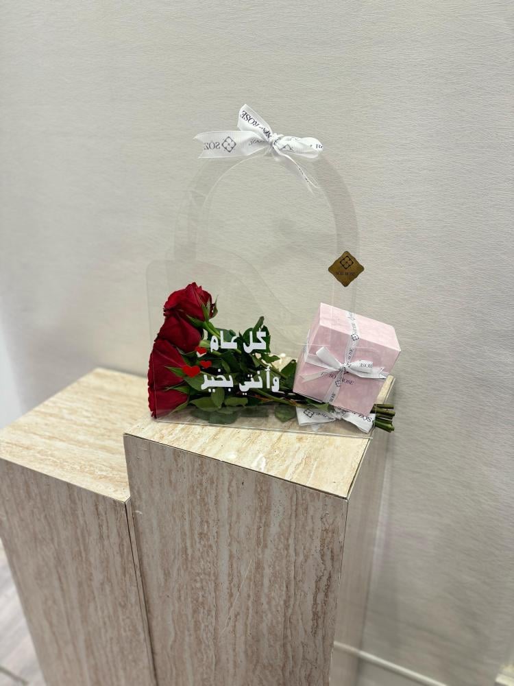 هذه الباقة الفاخرة بورود حمراء رائعة مع سلسال كورال بتصميم قلب مرصع داخل علبة سوداء صغيرة مع تغريسة عيد مميزة على شكل هلال ذهبي مكتوب عليه عيدكم مبارك...
