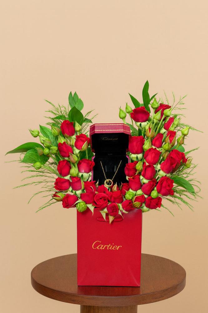 تنسيق فاخر يجمع بين ورود الجوري الحمراء الفاخرة وسلسال أنيق مستوحى من Cartier، في تصميم يعكس قوة المشاعر وفخامة التفاصيل.كل وردة تحكي قصة حب، وكل لمعة...