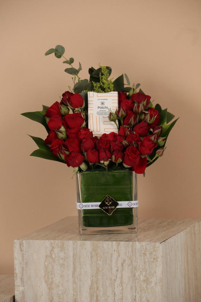 فازة الزهور الحمراء مع لوح شوكولاتة باتشي هدية فاخرة ومرتبّة لعيد الحب الزهور الحمراء تعكس مشاعر دافية وحب قوي مع لوح شوكولاتة باتشي اللي يضفي لمسة را...