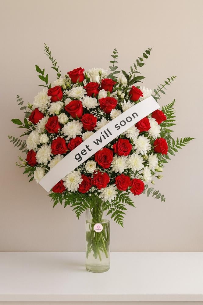 فازة زجاجية أنيقة تحتضن باقة الأمنيات الهادئة بتنسيق يجمع بين الأحمر الفاخر والأبيض النقي ليجسد رسالة دعم وأمل بالسلامة. جمالها ما يقتصر على كونها هدي...